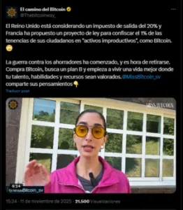 Guajardo difundió un video en el que reflexiona sobre una propuesta de ley en Francia para crear un nuevo impuesto sobre la «riqueza improductiva». Con ello, se busca gravar activos, considerados por ellos no productivos e incluyen a bitcoin y las criptomonedas en ese renglón, junto con yates de lujo, joyas, oro y terrenos sin usar, con el fin de incentivar inversiones productivas.
